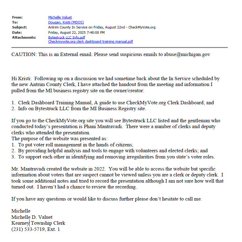 FINDING #2: Kearney Township Clerk, Michelle Valuet, took the initiative to perform a background check on http://CheckMyVote.org and share her findings with the MI Department of State. She references a previous…